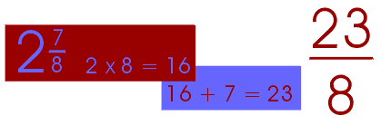 To convert a mixed number to a fraction, multiply the whole number by the denominator and add the answer to the numerator. This new number becomes the new numerator. Keep the original denominator.