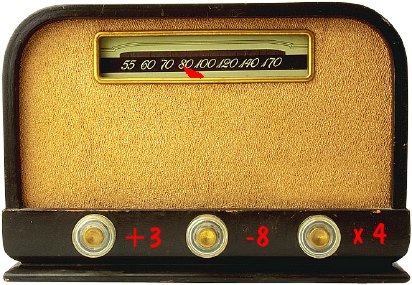 Each click of a knob changes the radio's setting by the number of the knob's function. For example, each time the left knob is clicked, 3 is added to the radio's setting. Let's say the radio is set on 16. We move the left knob 1 click, the middle knob 2 clicks, and the right knob 2 clicks.